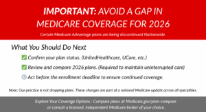 Disclaimer: Our Practice is not affiliated with The Heppner Group, Medicare, or any insurance plan, and does not receive compensation for sharing this information. The Heppner Group is an independent, licensed brokerage provided here solely as an educational resource. Patients are encouraged to review their plan options through Medicare.gov or with any licensed broker of their choice. Our practice does not sell insurance and does not provide legal or tax advice. Coverage and network participation depend on the plan you select.